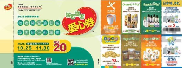 CFSC 於10月25日至11月30日進行「敬老護老愛心券2025」慈善籌款活動,每張愛心券港幣$20,附送8張由不同企業贊助的優惠券,讓您在行善之餘亦可享受生活小確幸。所有善款收益扣除成本後,將全數用於支持本會長者服務及相關項目。